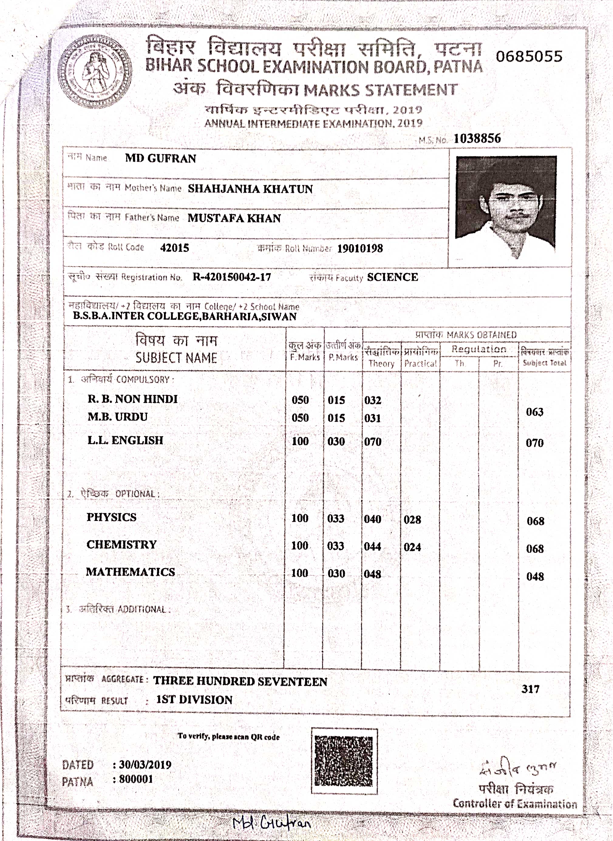 | Exam | Full Marks | Pass Marks | Marks Obtained |