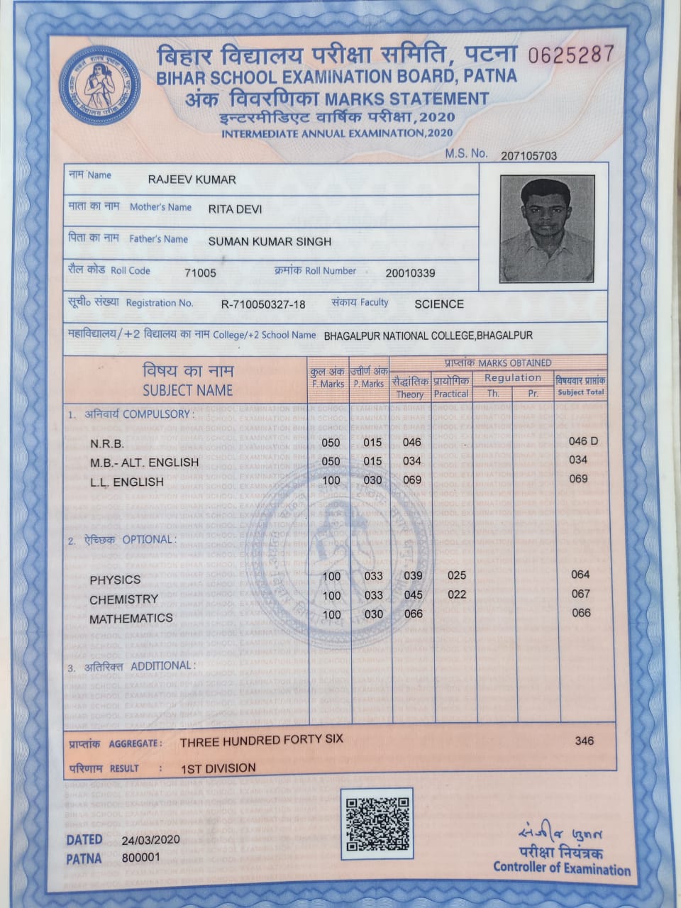 | Exam | Full Marks | Pass Marks | Marks Obtained |