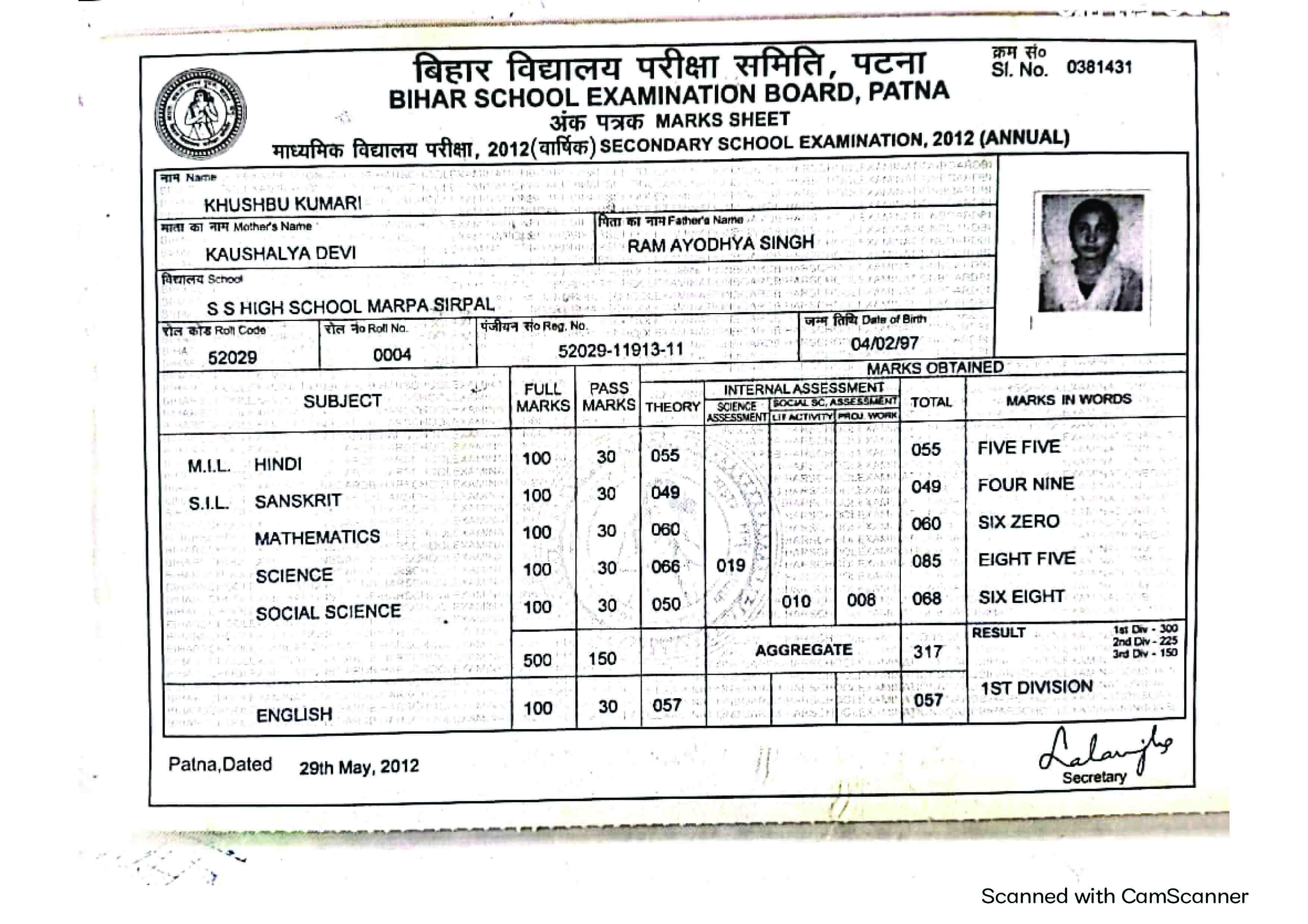 | Exam | Full Marks | Pass Marks | Marks Obtained |