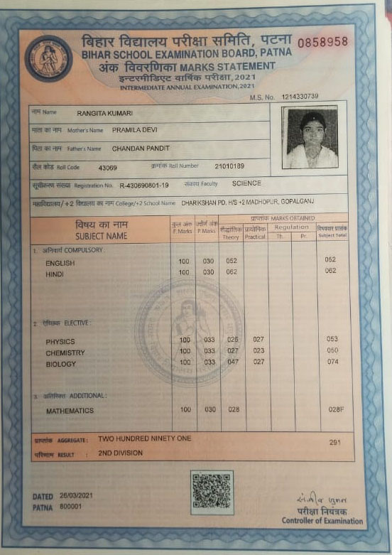 | Exam | Full Marks | Pass Marks | Marks Obtained |