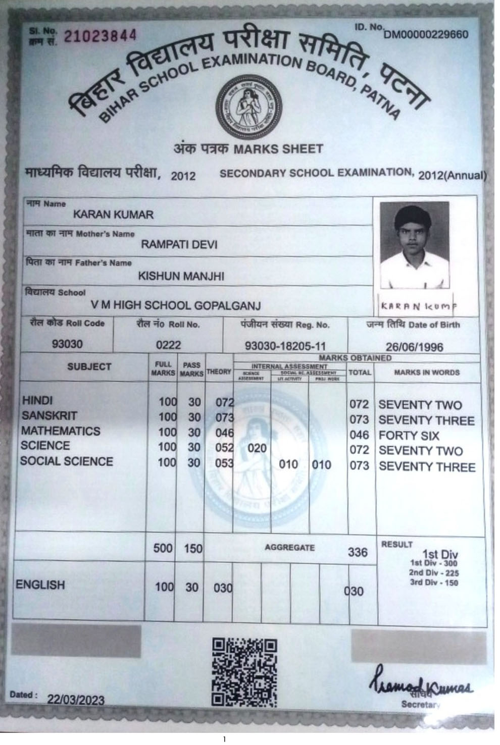 | Exam | Full Marks | Pass Marks | Marks Obtained |