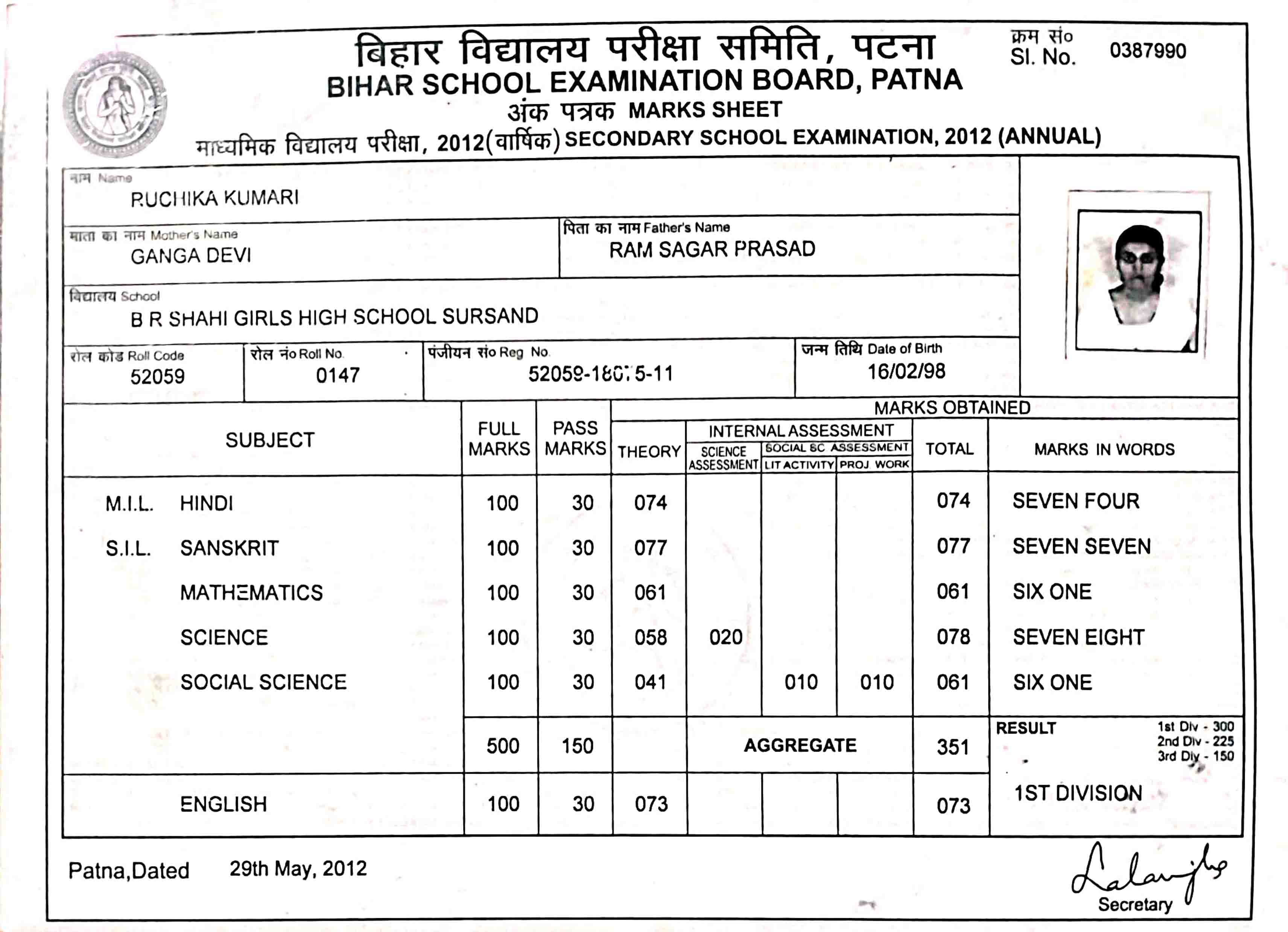 | Exam | Full Marks | Pass Marks | Marks Obtained |