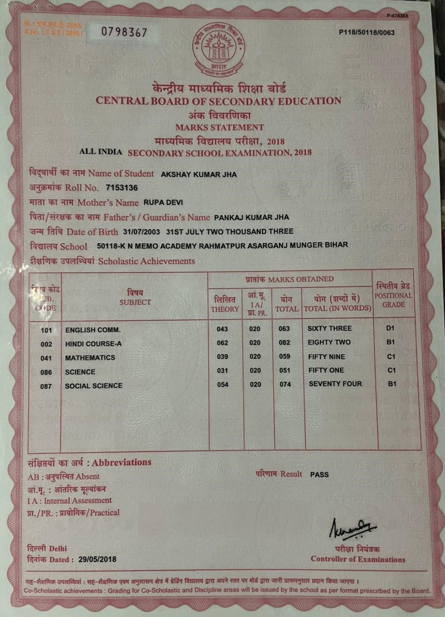 | Exam | Full Marks | Pass Marks | Marks Obtained |