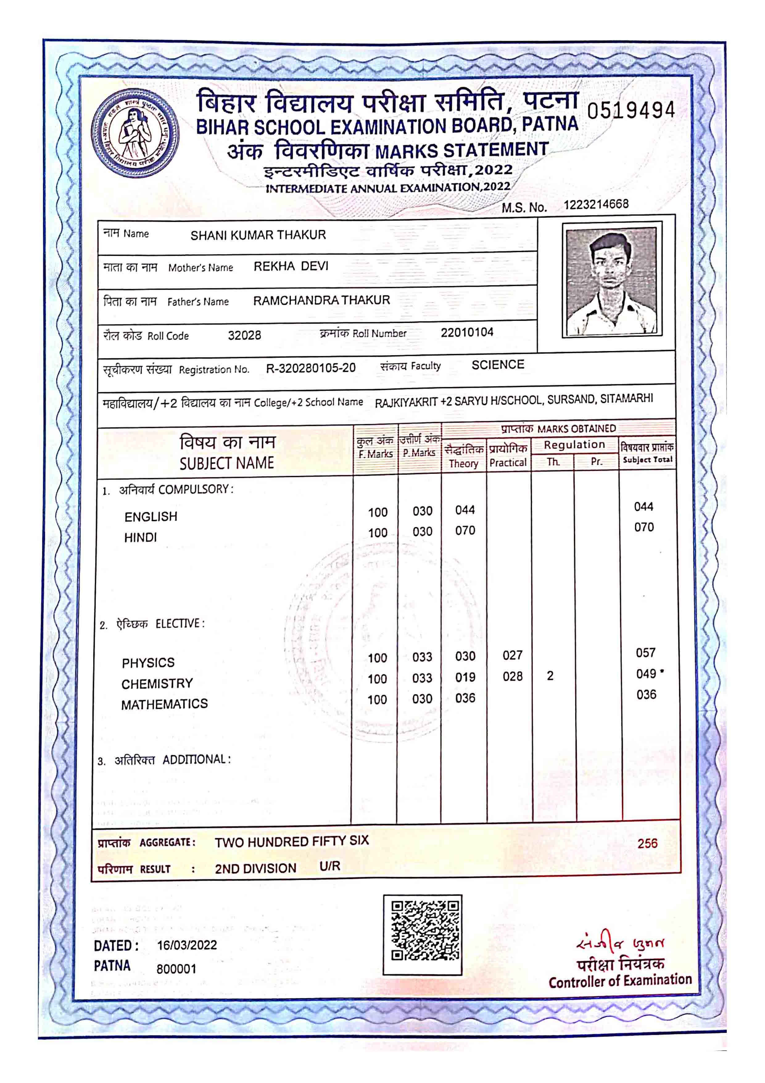 | Exam | Full Marks | Pass Marks | Marks Obtained |