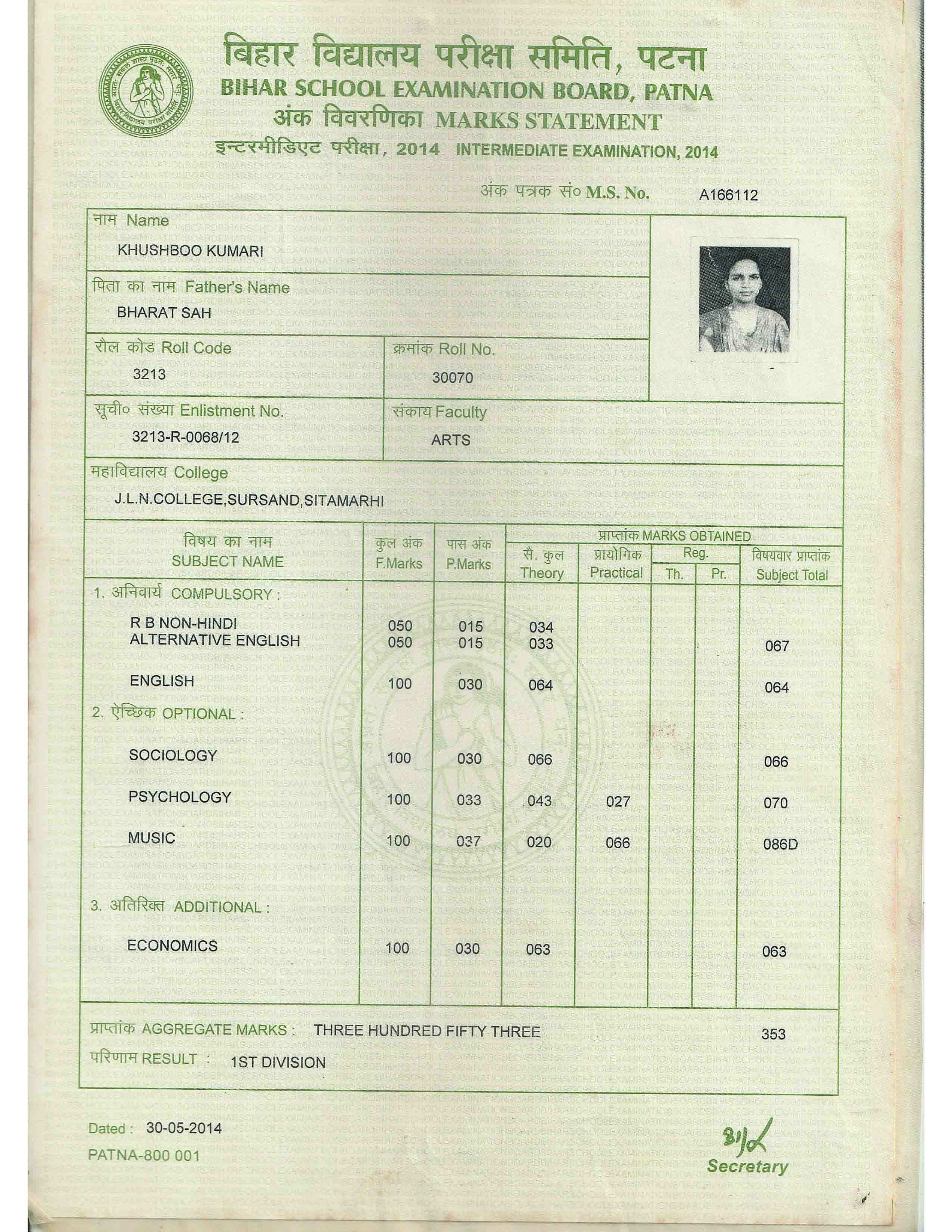 | Exam | Full Marks | Pass Marks | Marks Obtained |