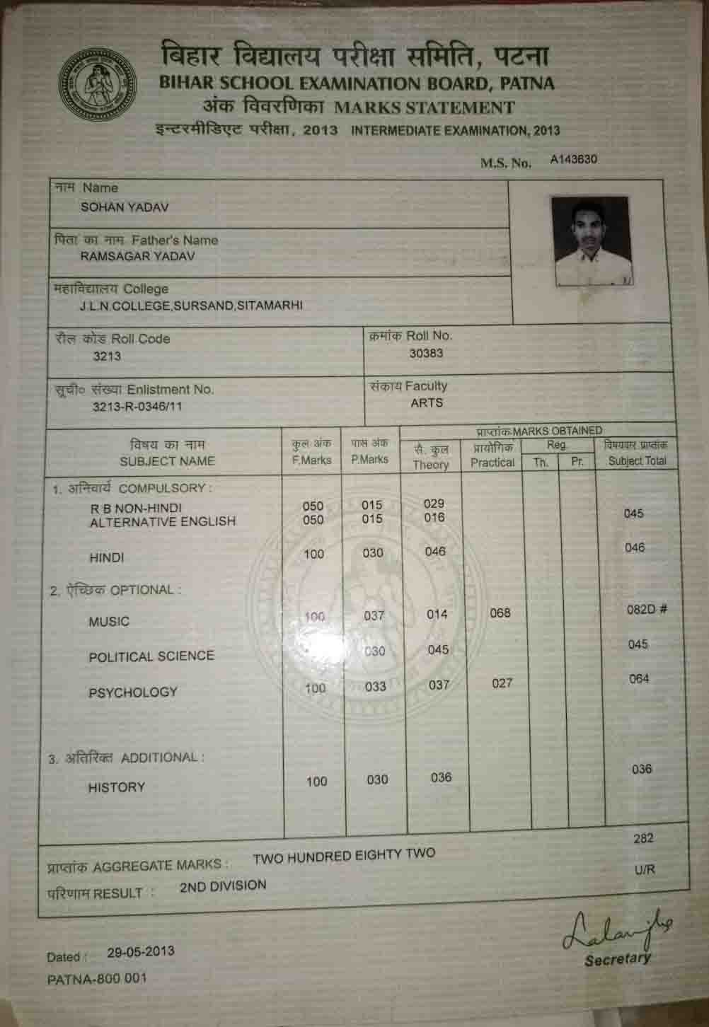 | Exam | Full Marks | Pass Marks | Marks Obtained |