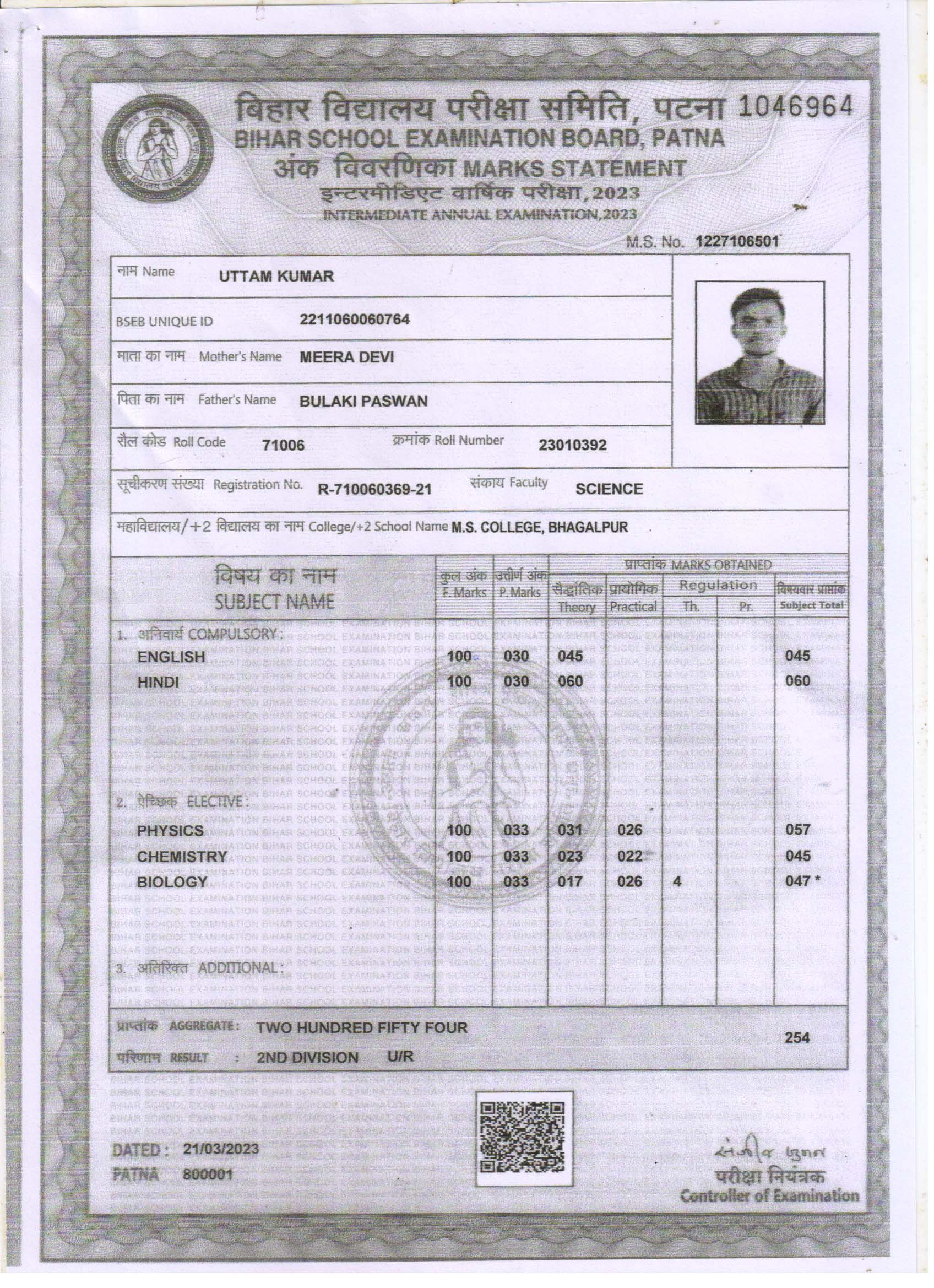 | Exam | Full Marks | Pass Marks | Marks Obtained |