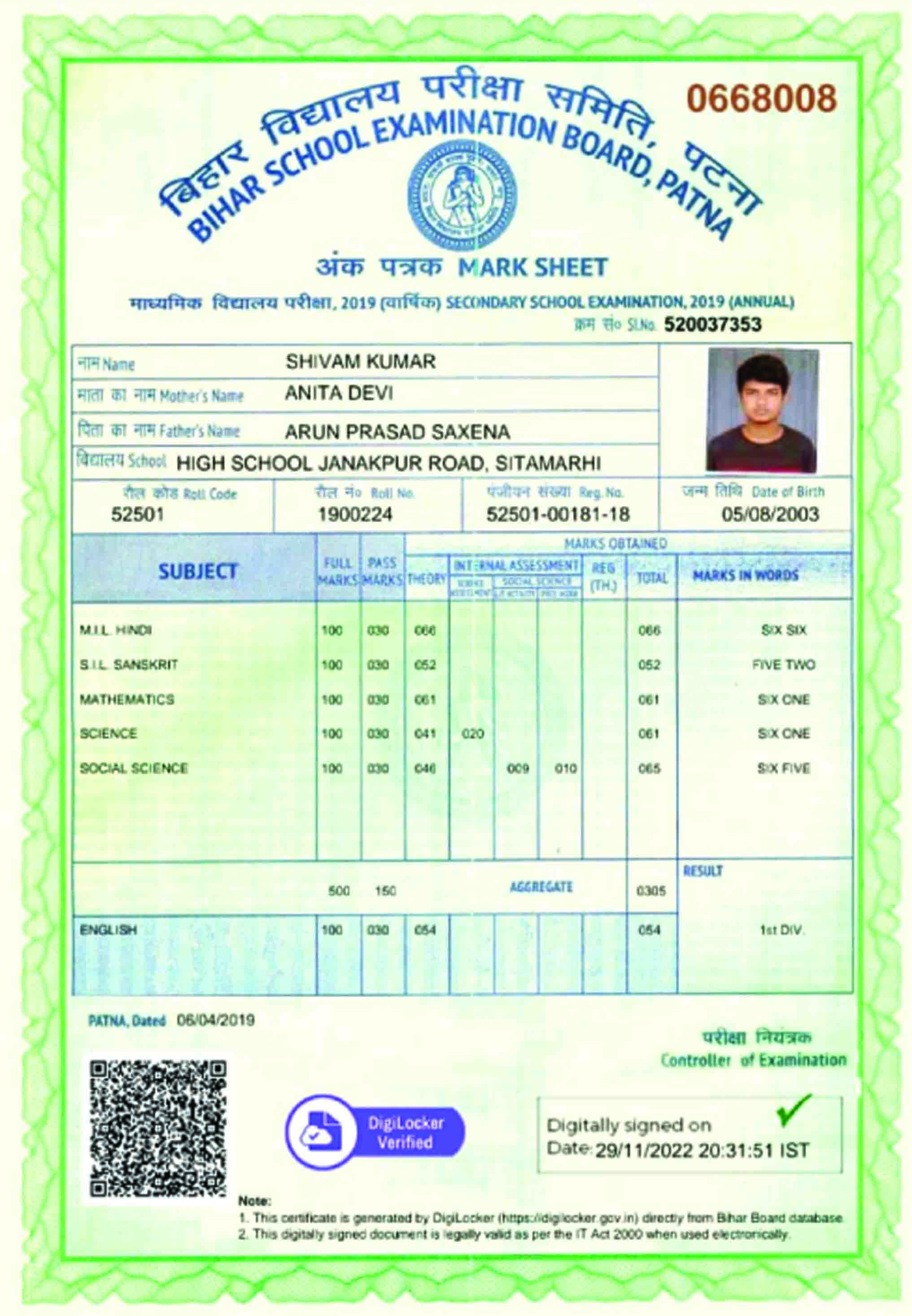 | Exam | Full Marks | Pass Marks | Marks Obtained |