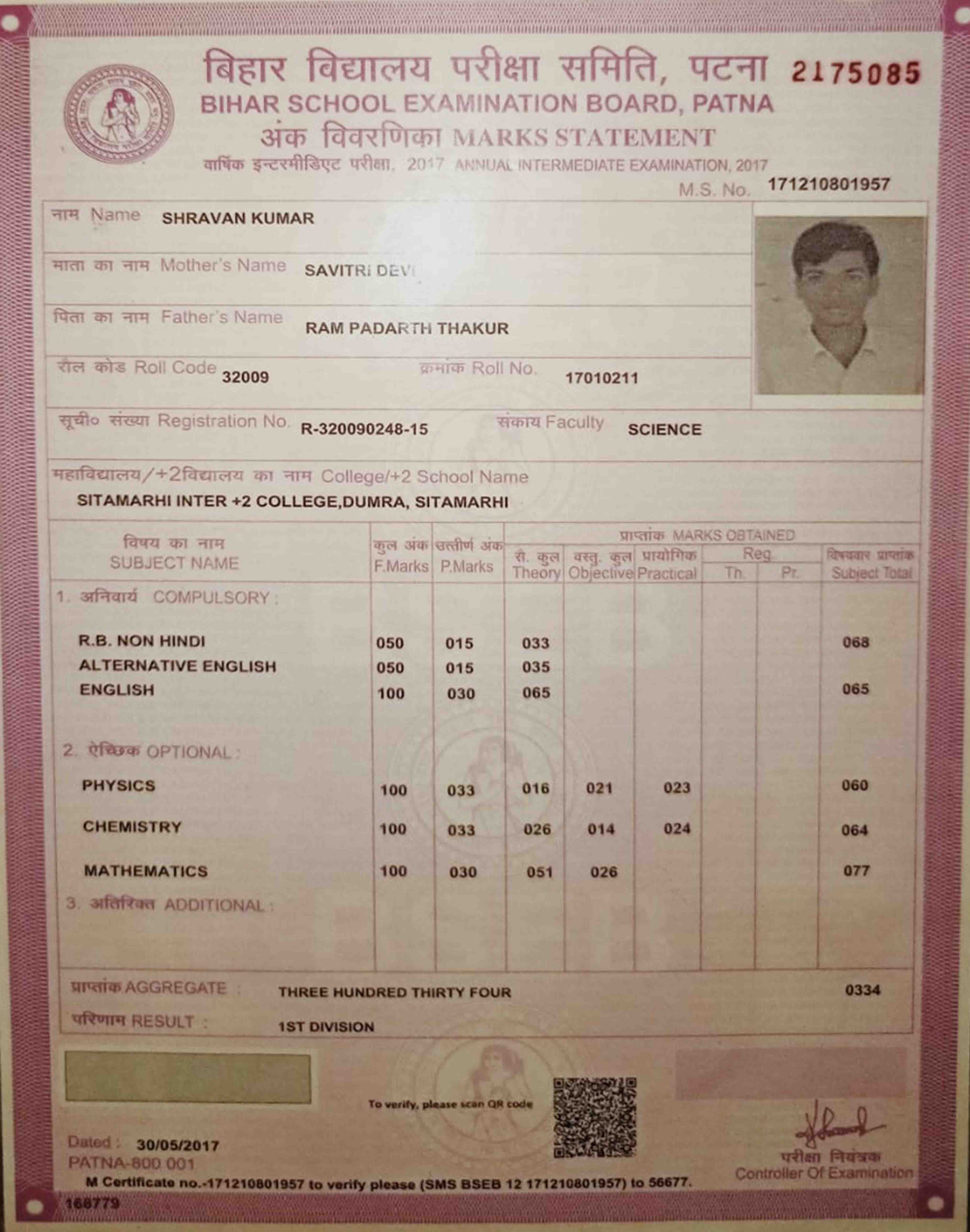 | Exam | Full Marks | Pass Marks | Marks Obtained |