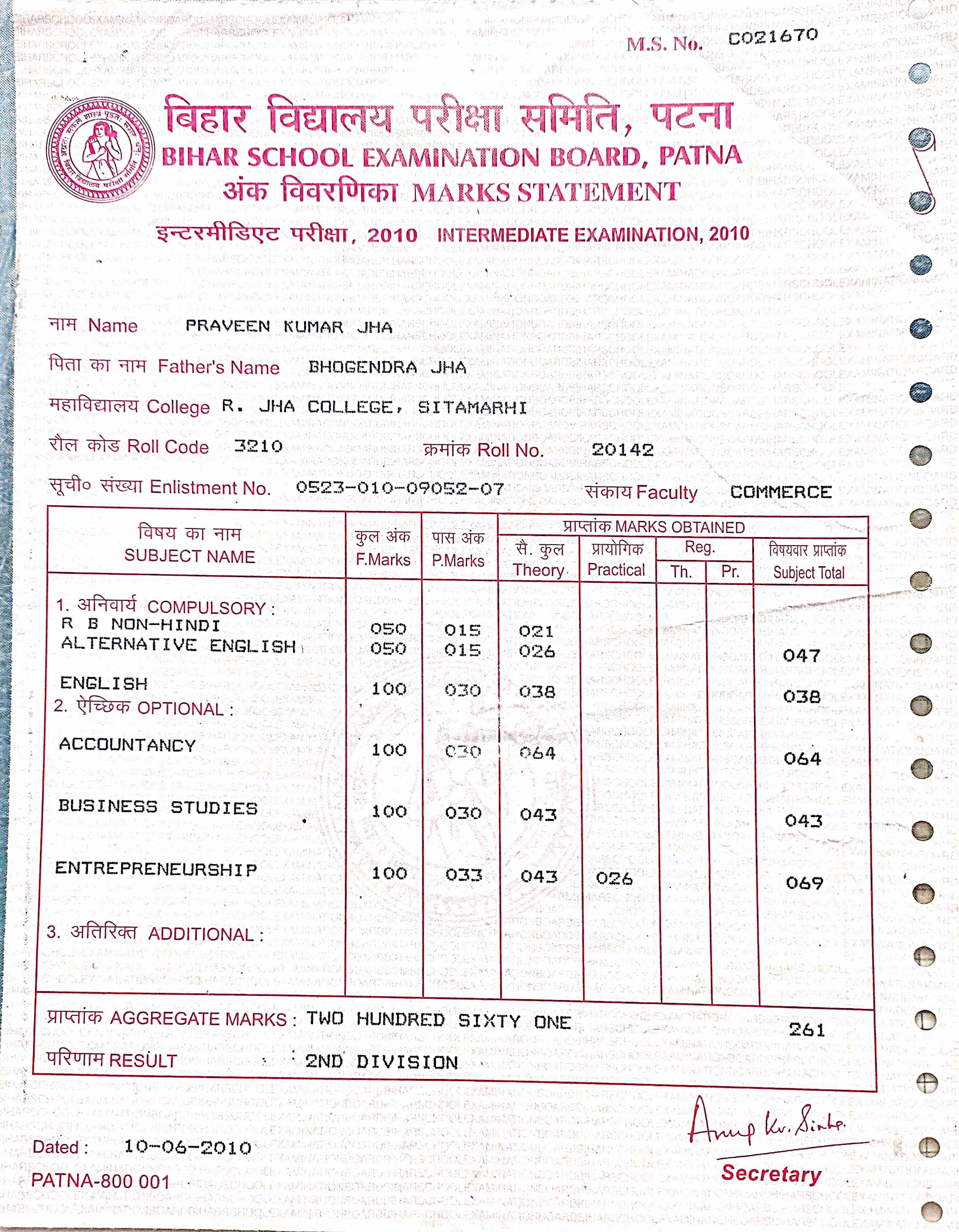 | Exam | Full Marks | Pass Marks | Marks Obtained |