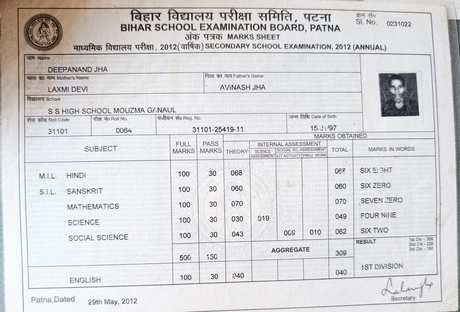 | Exam | Full Marks | Pass Marks | Marks Obtained |