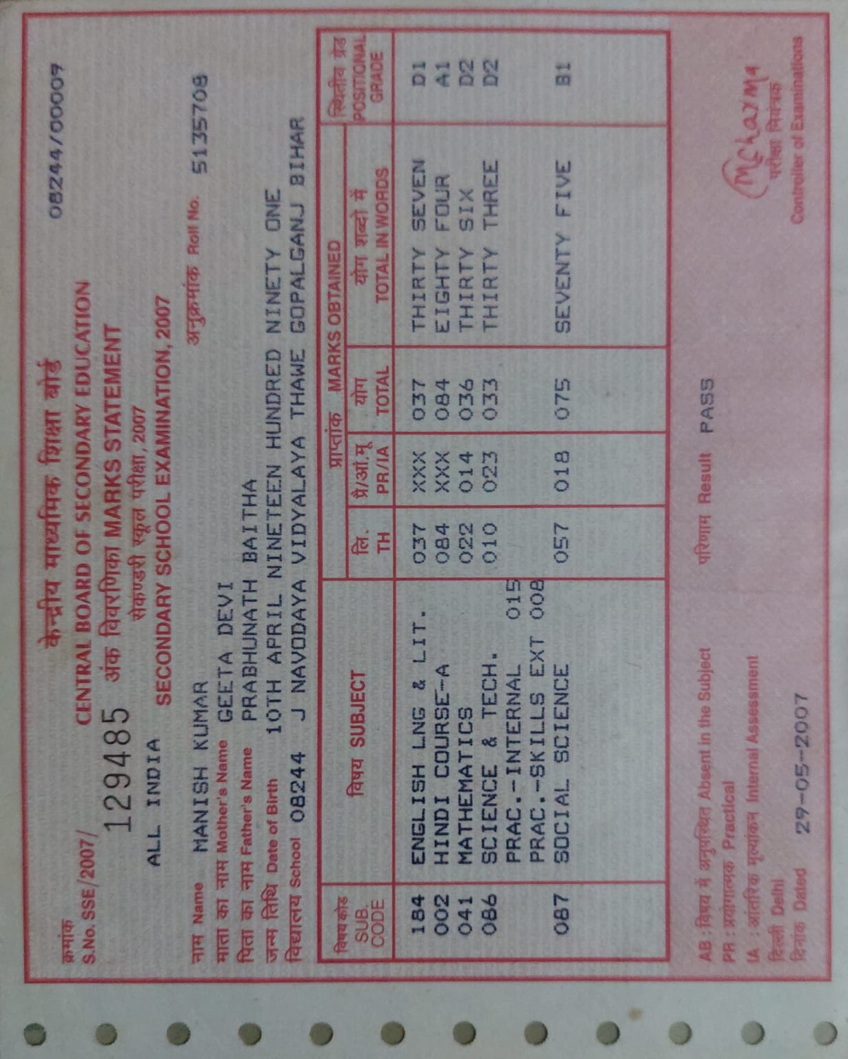 | Exam | Full Marks | Pass Marks | Marks Obtained |