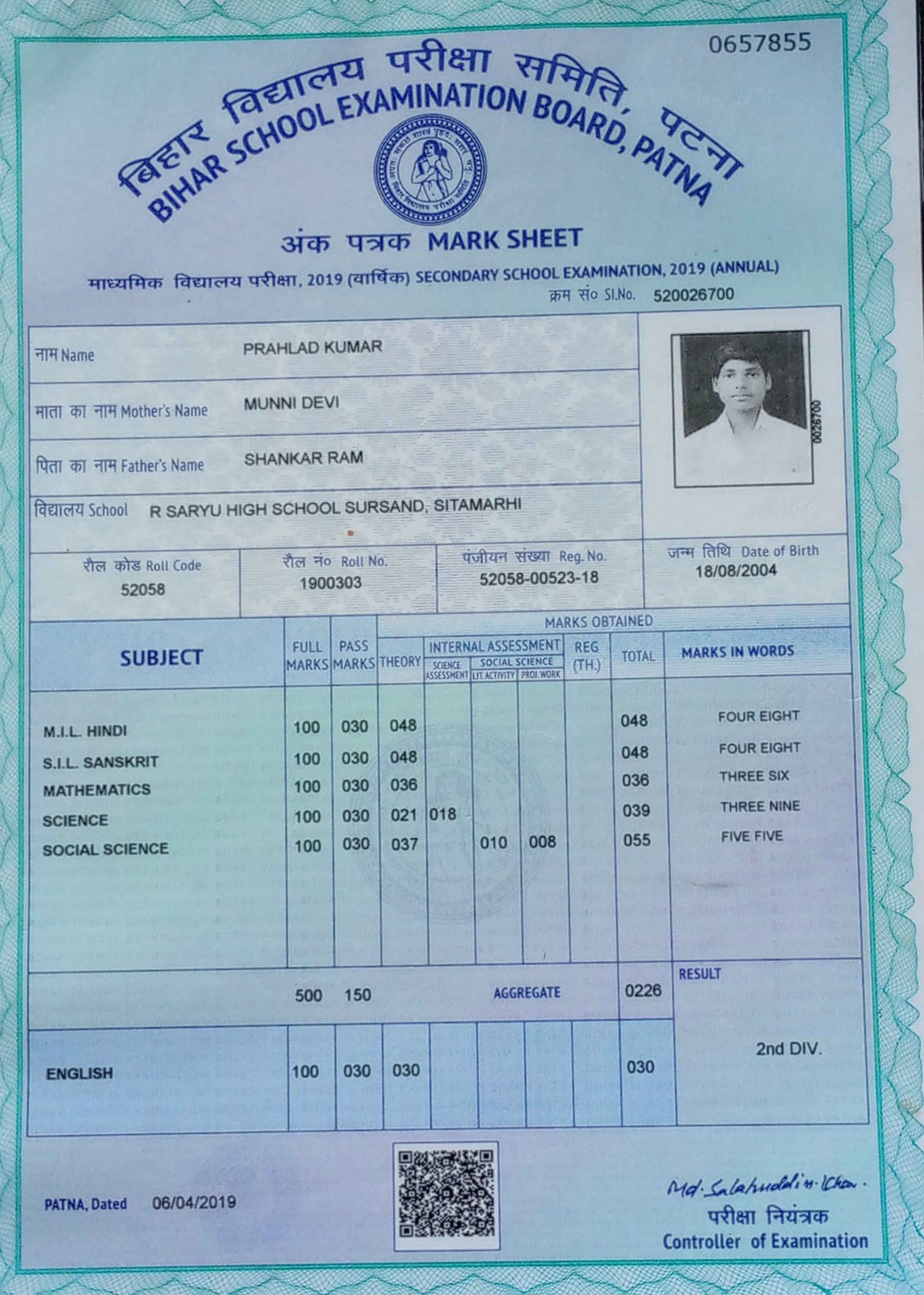 | Exam | Full Marks | Pass Marks | Marks Obtained |